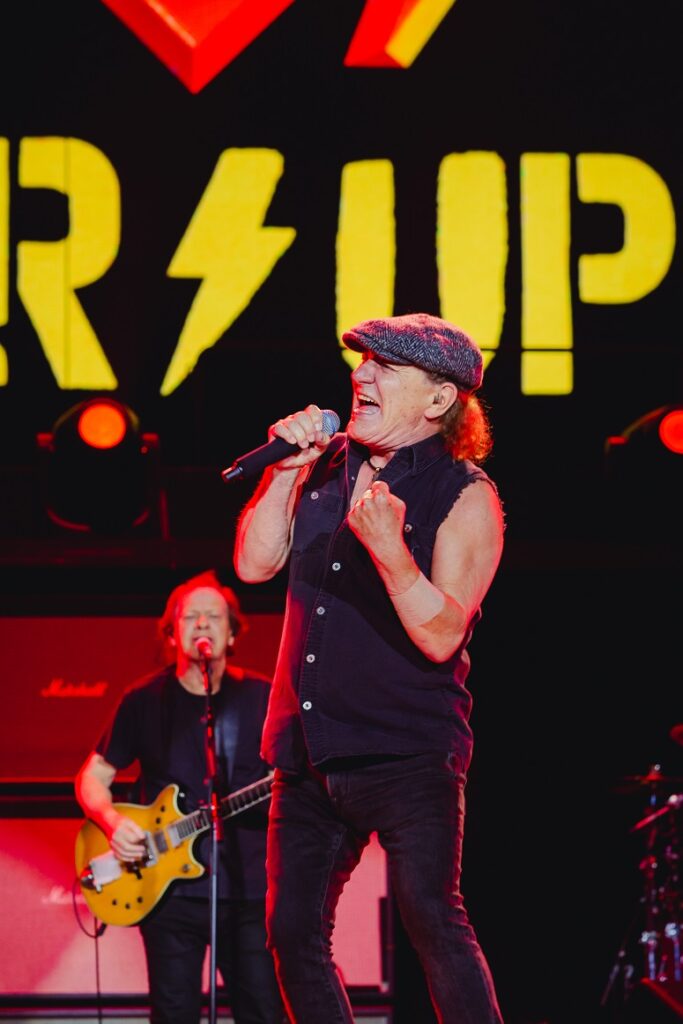 Brian Johnson (vocal), Angus Young (guitarra), Stevie Young (guitarra), Chris Chaney (baixo) e Matt Laug (bateria) entraram pontualmente às 21h e abriram a apresentação com “If You Want Blood (You’ve Got It)”, uma escolha que funcionou perfeitamente. Não houve aquecimento gradual. O AC/DC começou impondo volume, intenção e presença, como se dissesse logo no primeiro minuto que o show seria construído na marra dos riffs e na força de um repertório que não admite distração.