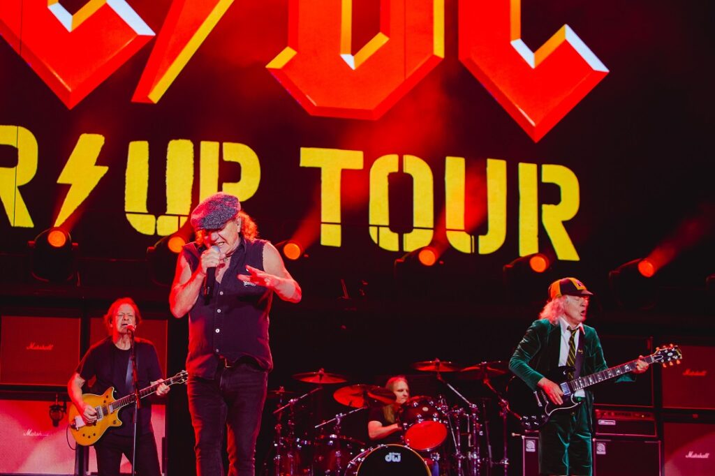 “You Shook Me All Night Long” apareceu, então, como um daqueles momentos em que o show deixa de ser apenas performance e se transforma em comunhão. Era inevitavelmente uma das mais cantadas da noite, com o estádio inteiro acompanhando cada verso como se participasse de um rito coletivo. Na sequência, “Whole Lotta Rosie” recolocou a apresentação em modo de festa total, unindo peso, irreverência e aquele espírito de estrada que o AC/DC carrega como poucos. A essa altura, já não se tratava apenas de assistir a um grande show, mas de mergulhar por completo no universo da banda e permanecer ali até o último acorde.
