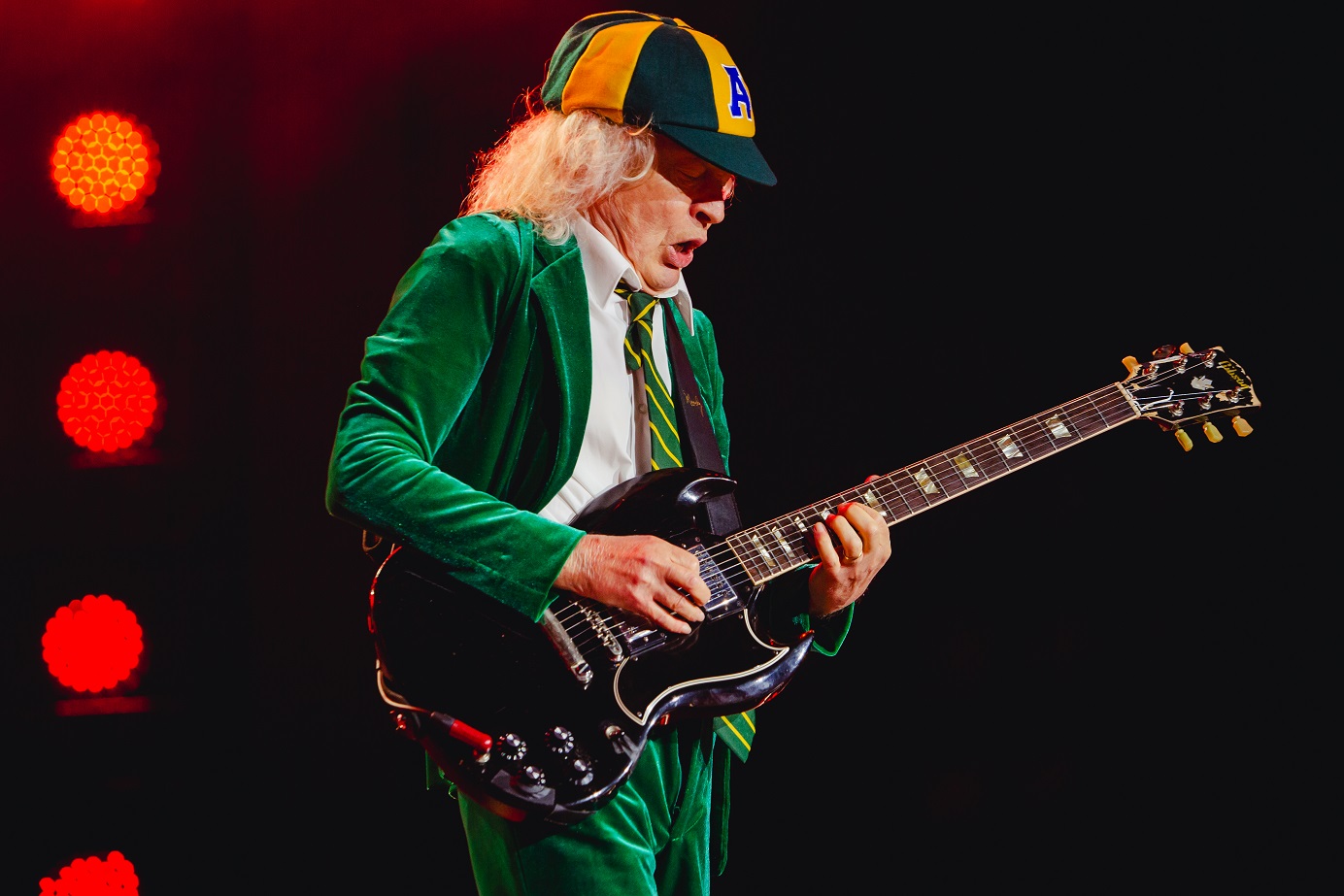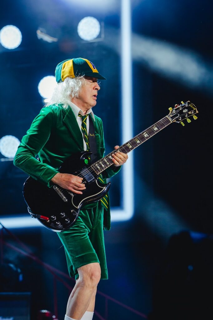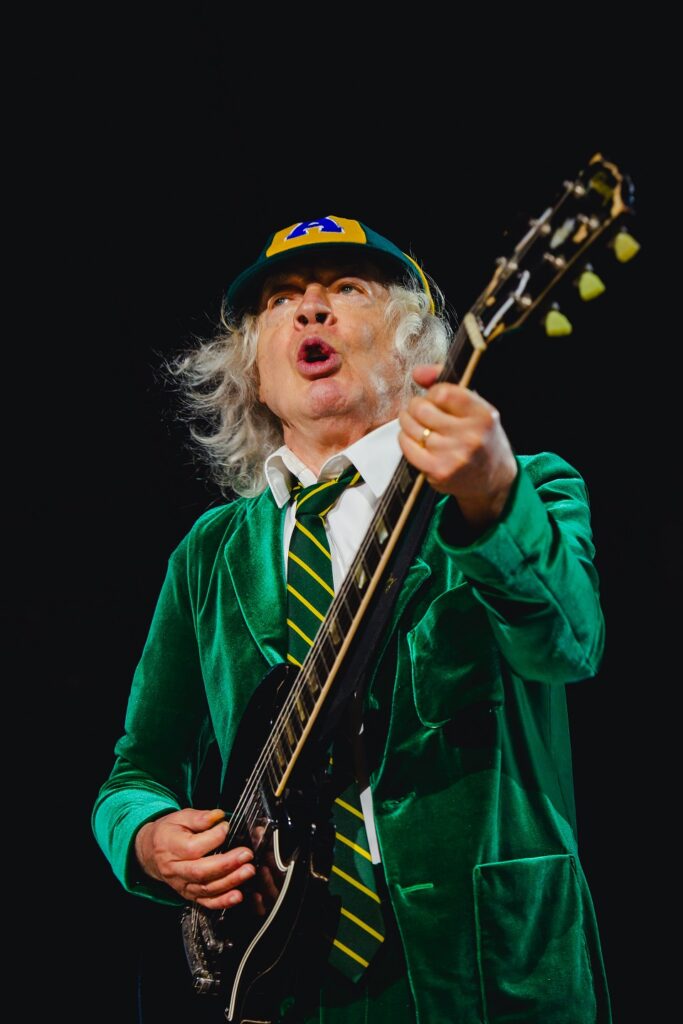E então veio “Let There Be Rock”, o coração performático da noite. Mais do que uma música dentro do set, ela surgiu como plataforma para Angus Young fazer o que faz de melhor: transformar solo em narrativa, virtuosismo em espetáculo e insistência em linguagem. O trecho estendido de guitarra foi recebido com fascínio e festa, e não por acaso. Angus não toca apenas para impressionar. Ele toca para incendiar. E incendiou. O MorumBIS inteiro orbitou sua guitarra naquele momento.
