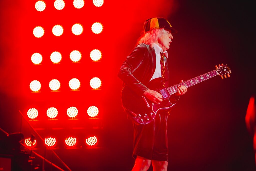A banda emendou na reta final “Dirty Deeds Done Dirt Cheap” e “High Voltage” como duas pancadas, reafirmando a veia mais crua, direta e insolente do grupo, antes de despejar “Riff Raff” com energia impressionante e que fez o bloco crescer ainda mais. Foi um trecho em que a banda soou particularmente solta e afiada, sem qualquer traço de automatismo. Brian Johnson conduzia a linha de frente com carisma, experiência e presença cênica, enquanto Angus Young seguia como centro gravitacional, guiando o olhar do público e a pulsação emocional do MorumBIS.