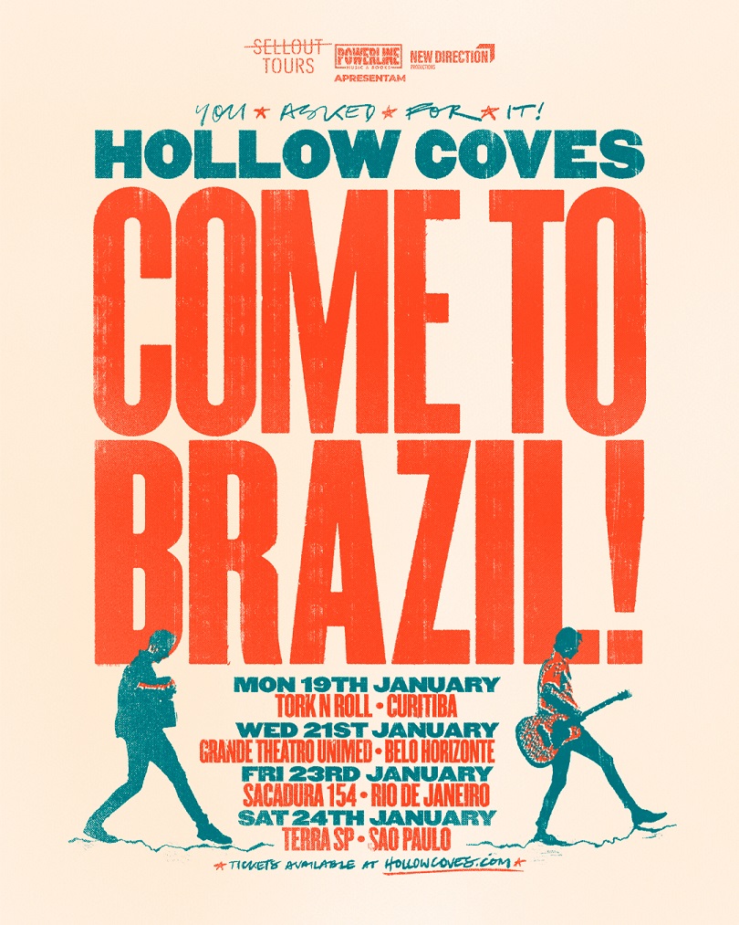 As produtoras Sellout Tours, Powerline Music & Books e ND Productions anunciam a estreia do duo australiano Hollow Coves no Brasil, em janeiro de 2026. Conhecidos por seu indie-folk envolvente e inspirador, Matt Carins e Ryan Henderson farão quatro apresentações no país: Curitiba (19/01), Belo Horizonte (21/01), Rio de Janeiro (23/01) e São Paulo (24/01).