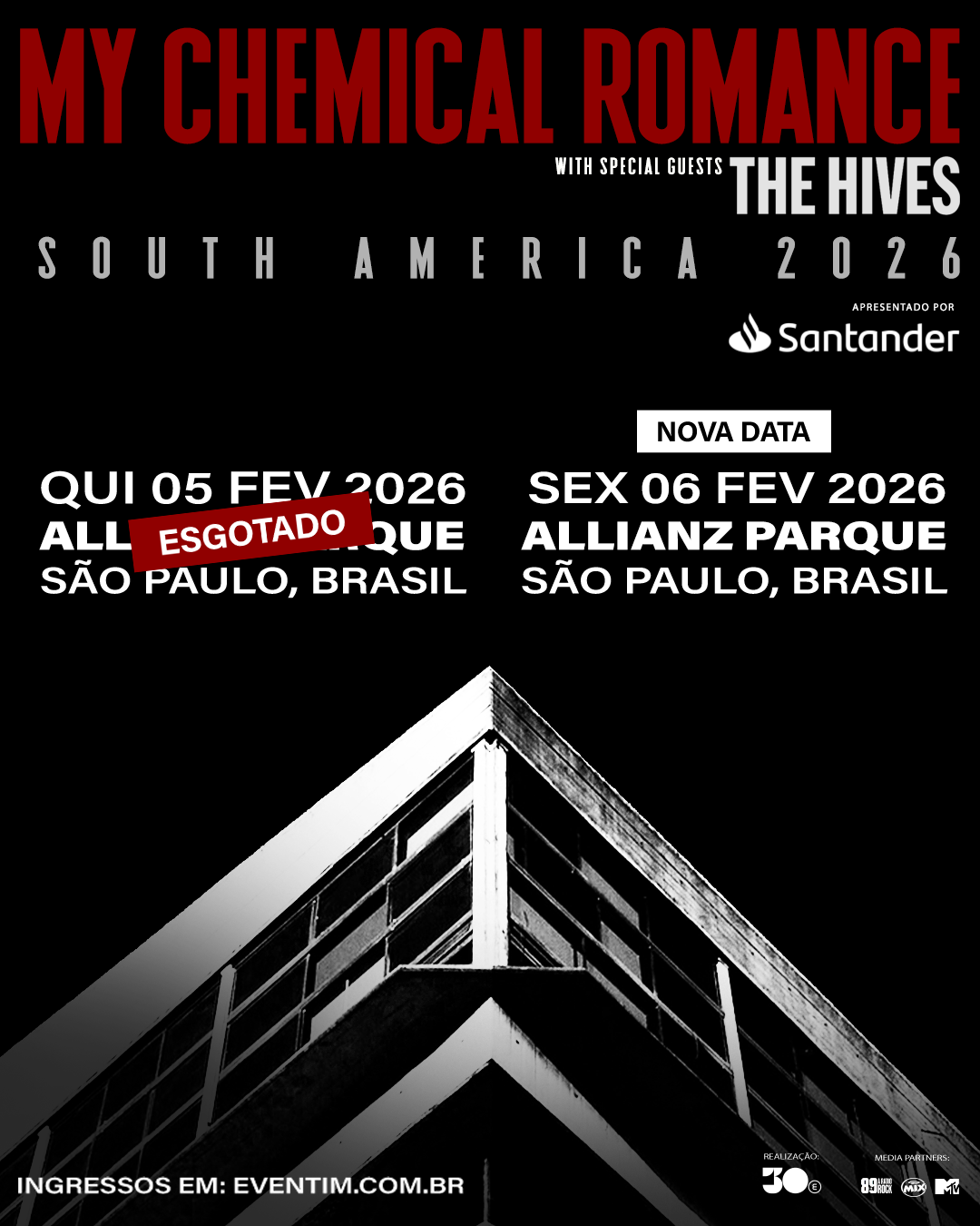 Após sold-out da apresentação de 5 de fevereiro de 2026, 30e, maior companhia brasileira de entretenimento ao vivo, anuncia a abertura de vendas da segunda data do My Chemical Romance no Allianz Parque, em São Paulo. Os ingressos para a noite de 6 de fevereiro de 2026, também apresentado pelo Santander Brasil, estão disponíveis a partir de hoje (3/07), ao meio-dia, no site da Eventim (acesse aqui).